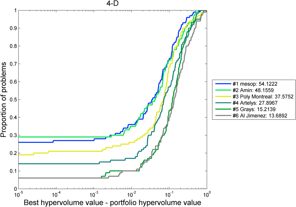 On each problem participants were judged by the overall dominated hypervolume within the given budget of function evaluations. There were 6 participants in the field. The best function value per problem and participant (1000 times 6 double precision numbers) is listed in this text file.