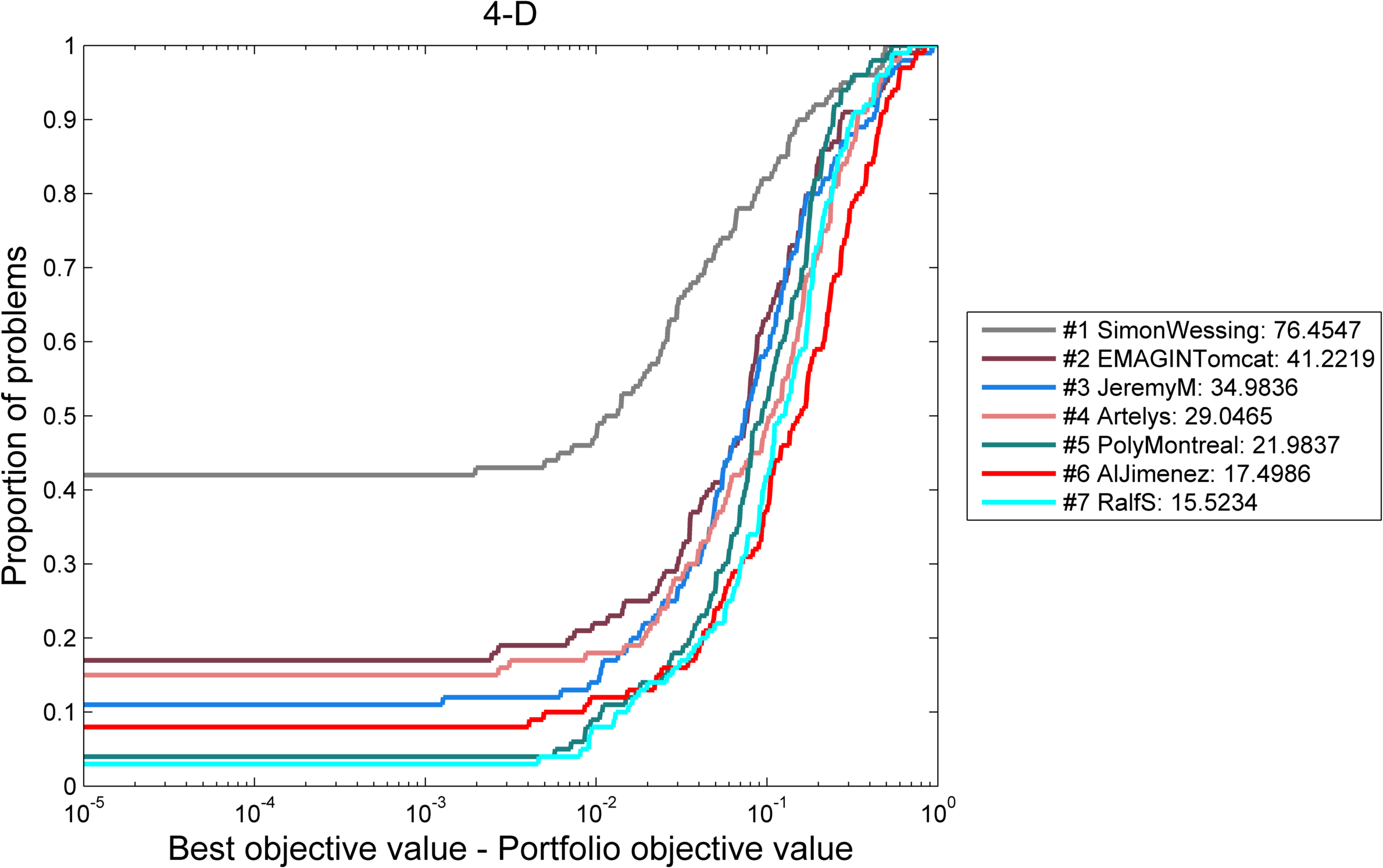 Participants were ranked based on aggregated problem-wise ranks (details here and here). The following results table lists participants with overall scores (higher is better) and the sum of ranks over all problems (lower is better) The table can be sorted w.r.t. these criteria.